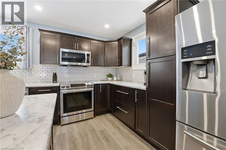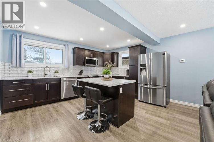 Welcome to 139 The Country Way, a thoughtfully updated four-level side-split offering a blend of space, comfort, and modern style. With 3 bedrooms, 2.5 bathrooms, and a fully finished layout top to bottom, this home delivers a surprising amount of livability in one of Kitchener's most established and convenient neighbourhoods. The open-concept kitchen/living room, redesigned in 2019, sets the tone with its clean lines, generous pantry storage, and an inviting island with a breakfast bar-an ideal hub for weekday routines or weekend gathering. The adjoining living room area feels bright and connected, creating an easy flow throughout the main level. A cozy main-floor family room with a fireplace provides an everyday retreat, complete with sliding doors that open onto the backyard. A convenient two-piece bathroom finishes this level for added functionality. Upstairs, the bedroom level is anchored by a beautifully updated main bathroom (2024) featuring modern finishes and a surprisingly spacious linen closet. All three bedrooms offer comfortable proportions and natural light. The lower-level rec room impresses with its high ceilings-an uncommon and welcome feature in a sidesplit-making the space feel open and versatile for media, play, fitness, or a home office. Additional office space and storage continue on the lowest level, offering flexibility for future needs. Set on a good-sized lot, the fenced backyard provides room for gardening, play, or simply enjoying time outdoors. A single-car garage and double driveway complete the exterior. This location is known for its quiet residential streets and strong community feel, with McLennans Park that features a dog park, trails, shopping, and everyday amenities all close at hand. Families appreciate the nearby schools, while commuters value the easy access to major routes connecting throughout Waterloo Region. (id:26452)