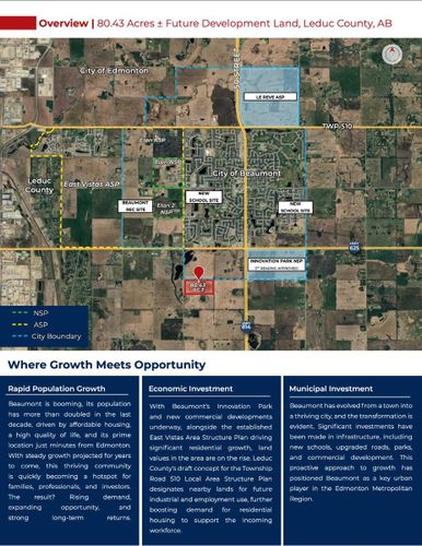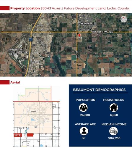80.43 acres ± of future development landLand neighbours City of Beaumont, located in Leduc County.Ideal for current agricultural use, agri-business ventures, or as a strategic investment for future value growthQuick access to amenities and major transportation routes from Highway 625 (Township Road 504)Close proximity to Beaumont, Nisku, and the EIA (id:26452)