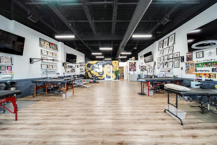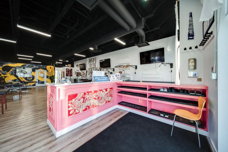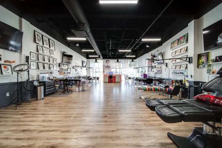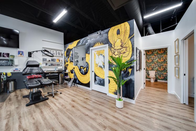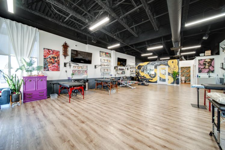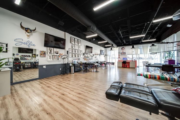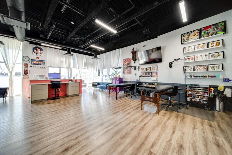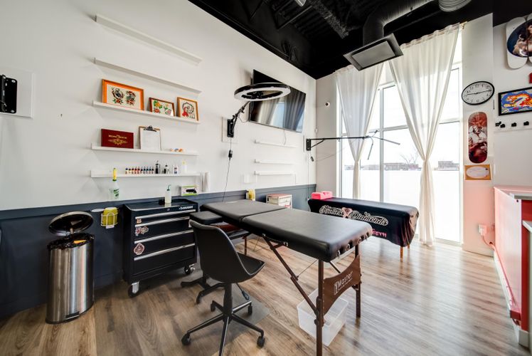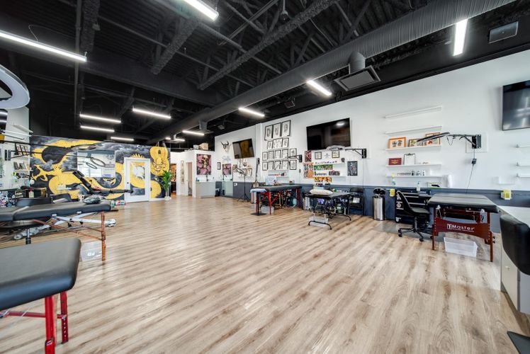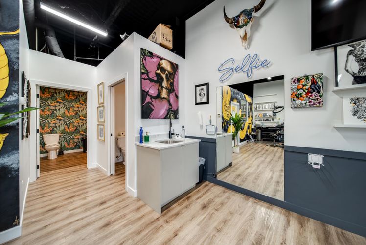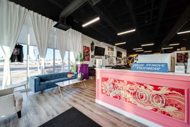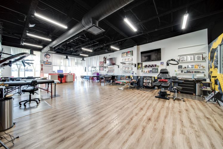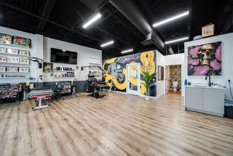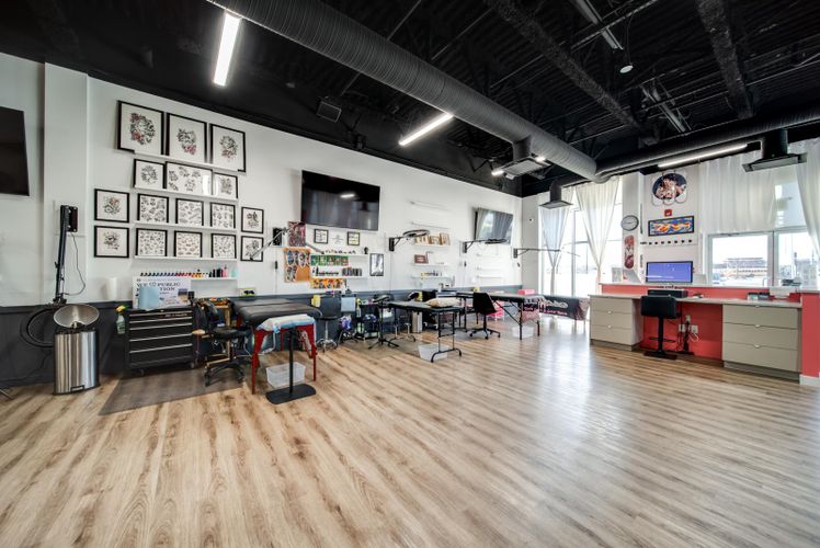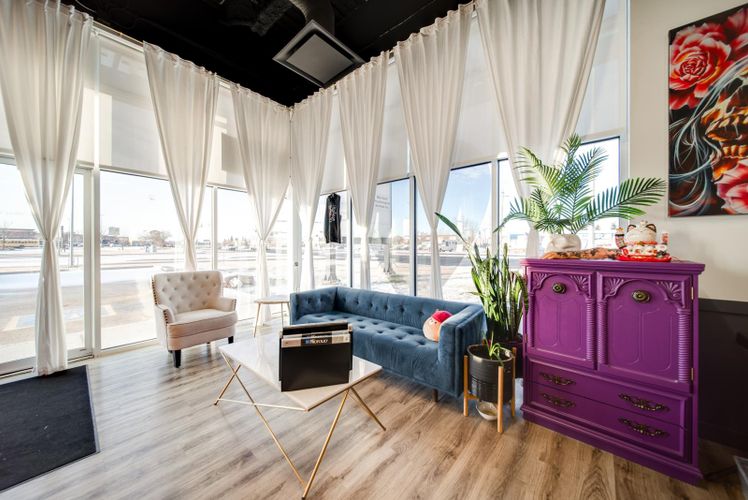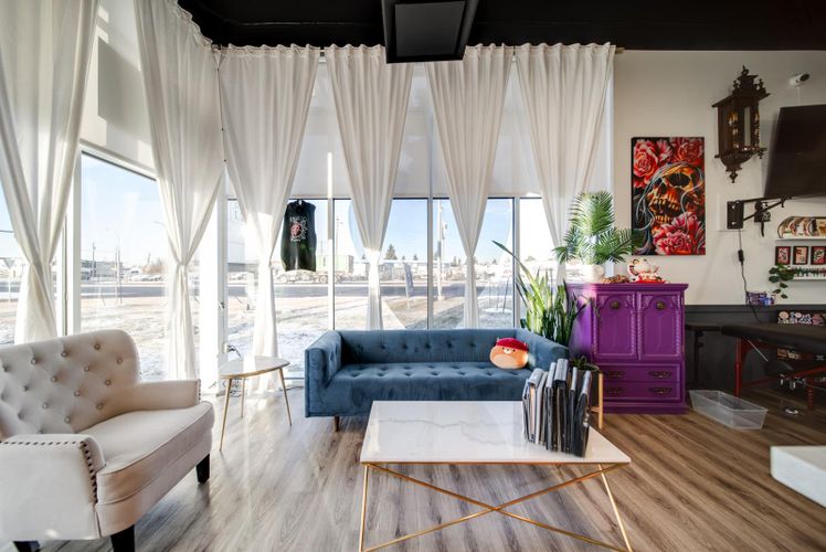 High exposure corner retail unit currently fixtured as a tattoo shop. Open retail space, staff room in back along with two washrooms. Exposed ceiling, LVP flooring and abundance of windows. Ample parking on and off site. (id:26452)