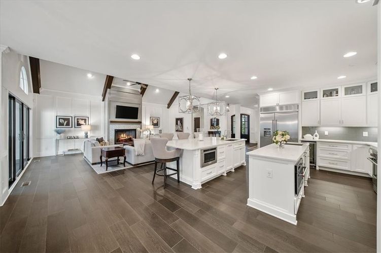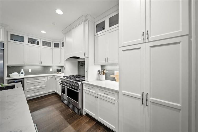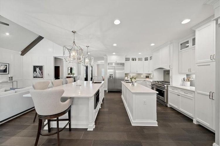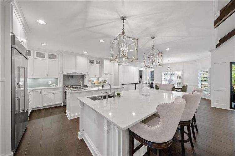 kitchen integrates captivating entertaining with ease & features quartz, commercial appliances, and custom cabinetry. The two islands/dual