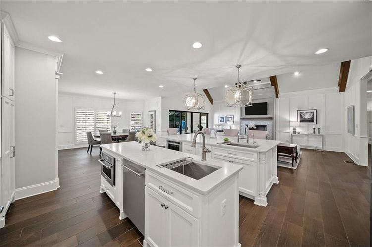 commercial appliances, and custom cabinetry. The two islands/dual sinks make prep work a delight and provide fun gathering time. The