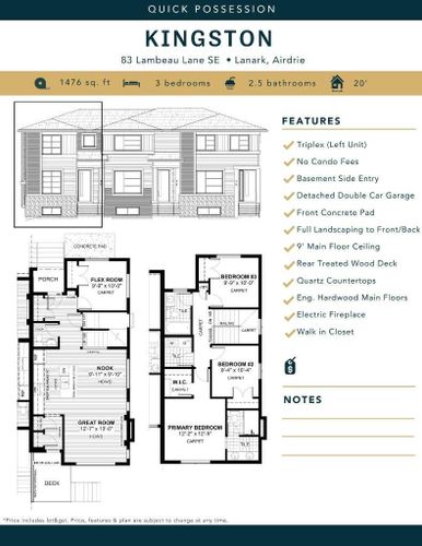 *NEW PRICE REFLECTING DEVELOPER BONUS INCENTIVE* IMMEDIATE POSSESSION, END UNIT, SIDE ENTRY TO BASEMENT. ,DOUBLE DETACHED GARAGE, DECK, FENCED AND LANDSCAPED, NO CONDO FEES. Welcome to the "Kingston" townhome, by Award winning, Master Builder, Douglas Homes Ltd. From the front covered porch, the entry opens onto the front flexroom/den with close by 2pc powder room. 9ft ceiling and hardwood floors throughout the main floor. The aspiring chef will appreciate the well planned "island" kitchen. From the upgraded 42 inch, soft close cabinets, to the gorgeous quartz countertops, everything is within easy reach. The sparkling stainless steel fridge, the glass top, self cleaning electric range, dishwasher, and over the range microwave/hoodfan are all just an arms length from the kitchen sink in the huge island. The spacious dining area features a large picture window. The spacious greatroom with feature electric fireplace, with large picture window looking out onto the large back yard, with lots of space for the kids to play. Also a rear entry door to the deck for those summer bbq's. Upstairs includes 2 good sized secondary bedrooms, a 4pce bathroom with quartz vanity and tile floors, a convenient upstairs laundry, and a spacious primary bedroom with large upsized window and ensuite bath, with walk in shower, with glass front, tile floor and again a quartz vanity with his n her sinks. The full basement provides rough in plumbing for a future bath, one window for future bedroom, and enough space remaining for a spacious future family room if you decide your family needs room to spread. . THIS IS AN END UNIT WITH SIDE ENTRY TO THE BASEMENT. (id:26452)
