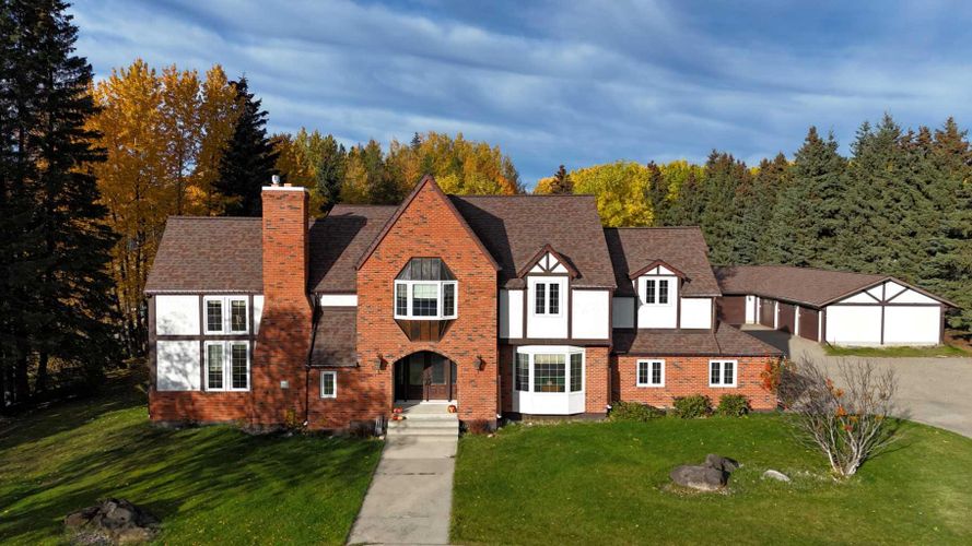 Prepare to be captivated by this completely renovated two-story Tudor-style residence, nestled on nearly two private acres. From the moment you enter, elegant arched entryways and exquisite craftsmanship set the tone for this remarkable home. The custom-built eat-in kitchen features granite countertops, a large center island, stainless steel appliances, and abundant cabinetry, perfect for any chef. A formal dining room offers an elegant setting for entertaining, while the family room and mudroom add comfort and practicality. The great room is the showpiece of the home, boasting soaring cathedral ceilings, a breathtaking two-story stone gas fireplace, and a spiral staircase leading to a floor-to-ceiling library loft, a true architectural highlight. Upstairs, the primary suite provides a luxurious retreat with a spacious walk-in closet, a stunning 5-piece ensuite, and convenient in-suite laundry. Three additional bedrooms and another 5-piece bathroom ensure plenty of space for family and guests. The fully finished basement offers a large recreation room, an additional bedroom, a 4-piece bathroom, and ample storage and utility space, perfect for kids, hobbies, or a home gym. Outside, enjoy the ultimate in outdoor living with a composite patio and pergola, firepit, pond, BBQ shelter, and hot tub. A paved circular driveway, RV parking, attached garage, and an additional heated 5-car garage provide abundant parking and space for all your vehicles and toys. This property blends timeless Tudor charm with modern luxury and functionality…a rare find in Edson! (id:26452)