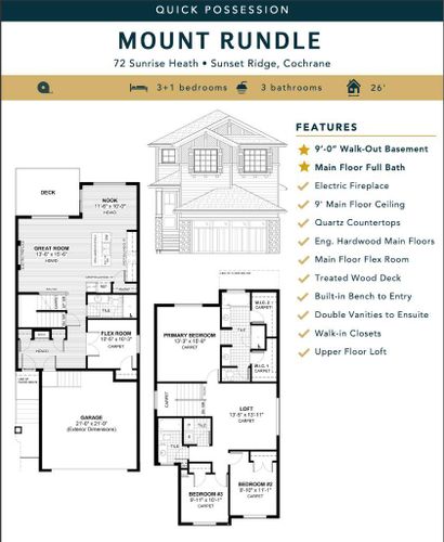Exceptional value in Sunset Ridge || Introducing the Mount Rundle by Douglas Homes Master Builder — a thoughtfully designed two-storey home with a full 9-ft walk-out basement, 3 + 1 bedrooms, 3 full bathrooms, and a flex room on the main floor. With its 26-ft wide design, this home balances modern comfort and practical living. The main floor features 9-ft ceilings, engineered hardwood floors, a bright great room with an electric fireplace, and a well-appointed kitchen with quartz countertops and stainless-steel appliances. A full bath and flex room on this level add everyday versatility — ideal for guests or a home office. Upstairs, you’ll find a spacious loft and three bedrooms, including a primary suite with dual walk-in closets and a private ensuite with double vanities. A treated wood deck completes the rear yard for easy outdoor enjoyment.If you have a young family, RancheView School (K–8) is just a few blocks away and St. Timothy High School is only minutes down Sunset Boulevard. The future community centre and a third school, when that’s done, will be within short walking distance. Weekend escapes to the mountains are a scenic 40–45 minutes away, while your commute back to Calgary takes roughly 30 minutes — about the same to Costco and 45 to the airport. (id:26452)