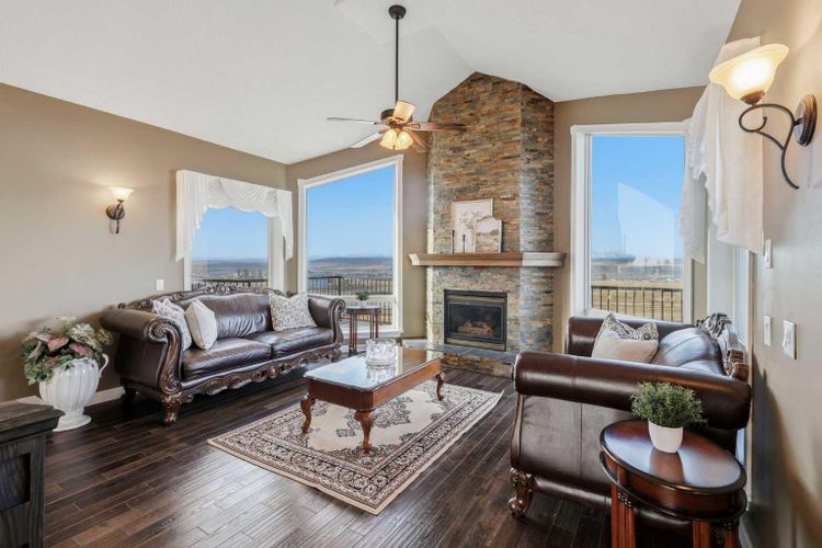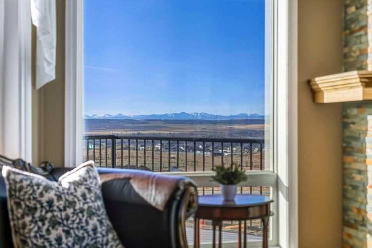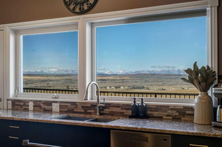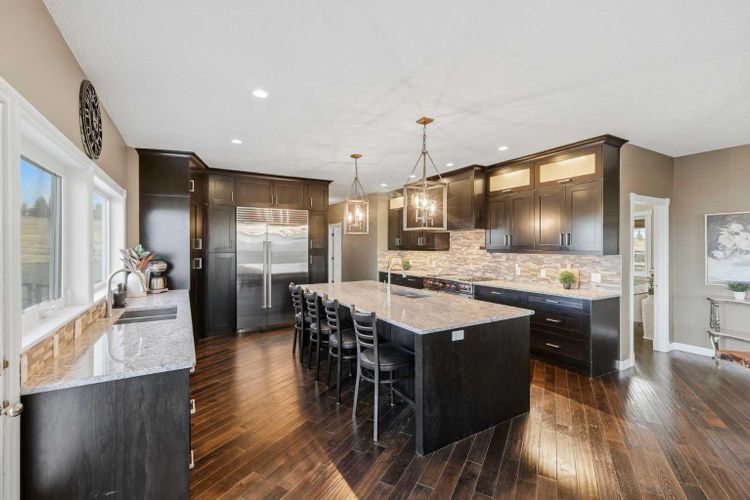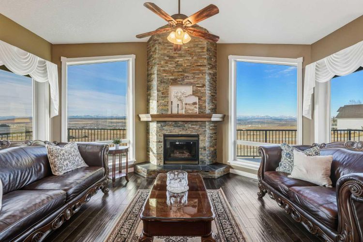 This stunning 4.41-acre property presents an exceptional opportunity to own a picturesque parcel of land with sweeping mountain views and a beautifully designed walkout bungalow. Nestled at the end of a serene, tree-lined drive, the home exudes timeless country charm with its sprawling layout, expansive wrap-around deck, and triple car garage — perfectly combining peaceful rural living with the convenience of being just minutes from Cochrane. Step inside the large front foyer, where vaulted ceilings immediately impress. The living room is a showpiece, centered around a dramatic floor-to-ceiling stone fireplace, with windows perfectly framing the breathtaking Rocky Mountain views. The spacious dining room is ideal for entertaining family and friends, offering ample space for large gatherings while enjoying the open-concept flow and natural light throughout. The chef-inspired kitchen is a standout, featuring a Wolf gas stove, Sub-Zero fridge, dual dishwashers, custom range hood, pot filler, and expansive granite countertops — perfect for both cooking and entertaining. A convenient office just off the kitchen provides a quiet workspace or flexible area. The primary suite is a tranquil retreat with spacious walk-in closets complete with organizers and private access to the west-facing deck. The ensuite bathroom is luxurious and spa-like, with double sinks, granite countertops, a large soaker tub, and a favorite feature of the current owners — an incredible steam shower. Two additional bedrooms and a full bathroom complete this wing of the home. The mudroom is highly functional, offering a half bath, laundry room with sink, and plenty of cabinetry and storage space. The attached triple garage is set up for both workshop and parking needs and is roughed in for in-floor heating and a future sink. Downstairs, the walkout basement continues to impress with a gas fireplace that anchors the space and creates a welcoming atmosphere. The expansive recreation area offers endless options — from a home gym to games or family entertaining space — all finished with durable slate flooring. The family room is perfect for movie nights or cozy evenings in. Two additional bedrooms and a full bathroom complete the lower level. Step outside to the covered patio with beautifully finished exposed aggregate concrete off the lower walkout — a generous outdoor space with room for a hot tub, sauna, or your dream outdoor living setup, all while enjoying awe-inspiring views! This home has seen thoughtful upgrades, including a new roof (2022), full replacement of poly-B plumbing, a water filtration system, a new electrical panel, a new concrete garage floor with rough-in for in-floor heating, a utility sink and a new concrete driveway apron. This exceptional property, complete with a barn, room for animals, and stunning mountain vistas, balances timeless country allure with comfort, functionality, and the perfect setting for family life! (id:26452)