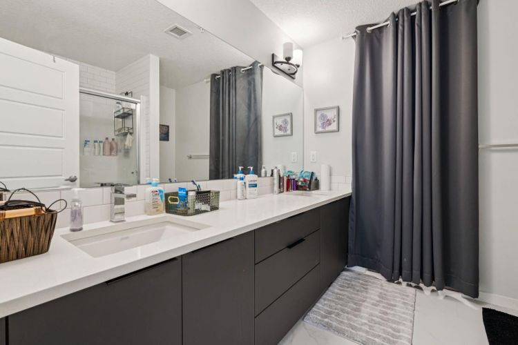 Welcome to Carrington Square - Northwest Calgary’s Premier Condominium Living || Built by CedarGlen Living, five-time winner of the CustomerInsight Builder of Choice Award, this sunny main floor unit offers exceptional quality, thoughtful design, and unbeatable value. || Boasting 1,180.88 sq. ft. RMS (1,262 sq. ft. builder size), this 3-bedroom, 2-bathroom home features a bright open layout with 9’ ceilings, triple-pane Low E windows, and luxury vinyl plank flooring throughout the main living areas. The modern kitchen is a showpiece, complete with engineered stone countertops, full-height cabinetry, subway tile backsplash, stainless steel appliances, and a large island ideal for entertaining. || The spacious living and dining area flow seamlessly onto the west-facing balcony, where you can enjoy your morning coffee and abundant natural light. The primary suite includes a generous walk-in closet and a 4-piece ensuite with dual sinks and an upgraded bank of drawers for added functionality. Two additional bedrooms and a full bathroom are perfectly positioned on the opposite side for privacy. || Additional highlights include in-suite laundry, a Fresh Air System (ERV), air conditioning, and a gas line for your BBQ. This home comes with a titled underground parking stall and a leased storage locker conveniently located on the main floor, not in the parkade. || Carrington Square is a PET-FRIENDLY community with unbeatable proximity to everyday conveniences, just steps from the new No Frills, shops, parks, playgrounds, a skate park, basketball courts, and scenic pathways. With quick access to 14th Street NW and Stoney Trail, commuting anywhere in the city is effortless. || Move-in ready and waiting for you to call it home. (id:26452)