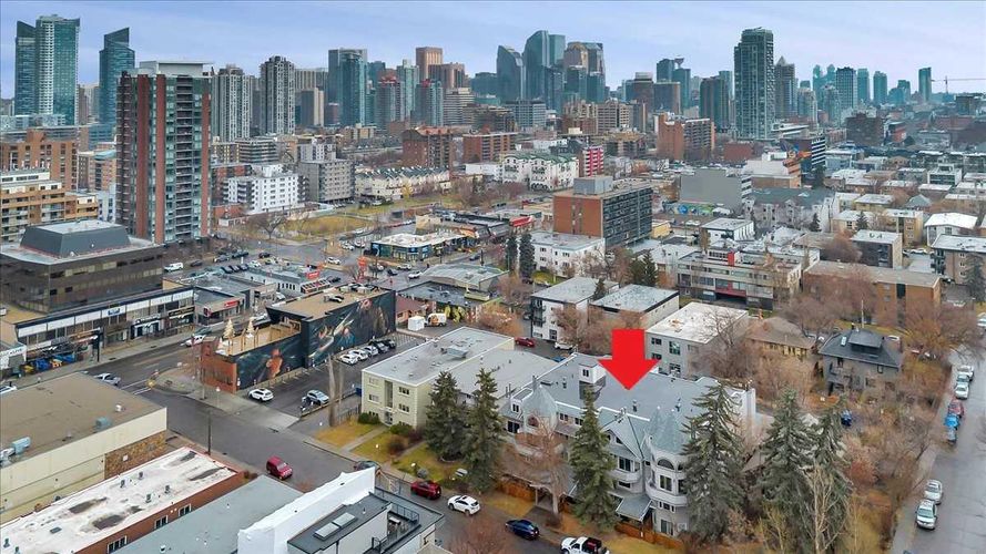 This is a standout spacious and upgraded unit with must-have features. Starting with the ideal CENTRAL LOCATION on a quiet street in Lower Mount Royal with easy access to restaurants, shops, downtown, and main roads. Everything you need is close by, including Mount Royal School, trendy 17th Avenue district, major transit routes, the Bow River Valley and more. This suite has modern finishes and functional layout with big separate living spaces allowing for many options to fit your lifestyle. The welcoming entrance gives access to a closet, half bathroom, upper level, and big dining space with a pantry to the side. The functional kitchen is complete with stainless-steel appliances, stone counter tops, soft close cabinets, and serving counter to a flex space. The grand living room features a two-story ceiling, fireplace, multiple west windows, and walkout to the patio. On the upper level the bonus space loft gives more options for living, work at home, gym, or a studio. The two bedrooms are big enough for a king bed and have great closet space. The main bathroom includes stylish finishes and shelving. Completing this full package is the laundry space with a top-end combination washer/dryer (non-venting). The 200+ sq ft private patio with evening sun is roofed, enclosed with fencing maintained by the condo, and finished with artificial turf.All spaces are bright, open, sunny, and easy keep. Most recent upgrades include the high efficiency wash/dryer, microwave hood fan, and various light fixtures. The fireplace is cleaned and inspected annually. Parking spot is covered, closest to back entrance, and easy access drive-through. This is a quiet and solid concrete frame building. It is well-maintained and funded. Common rooms include bike storage, recycling, and a laundry room. This MOVE-IN READY home truly is a must-see. (id:26452)
