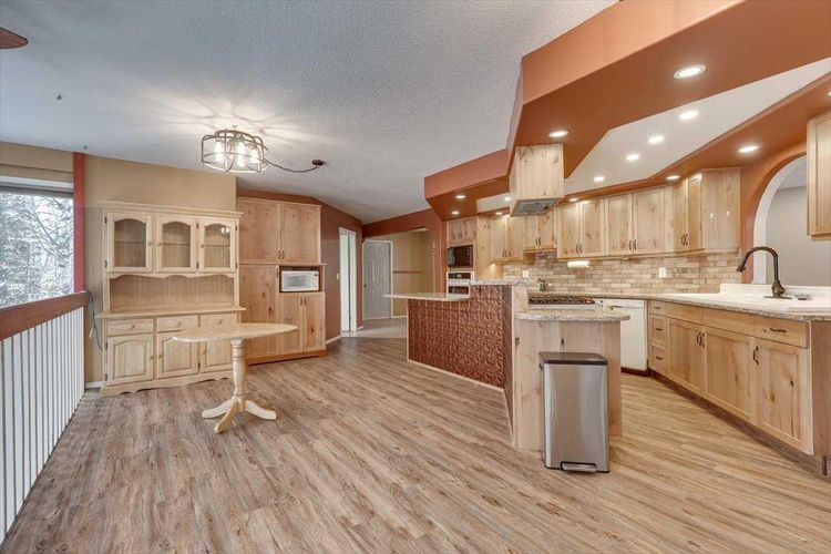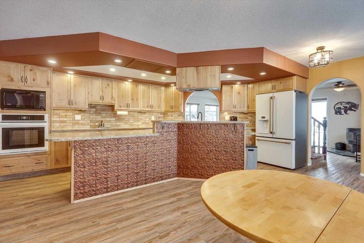 Stunning Acreage Living – Beautifully Updated 2 Storey Walk-out with over 3500 sq ft of living space! 5 bedroom (+2 Den) & 3.5 bath home with double attached heated garage on 5.85 Private Acres with Shop. Discover the perfect blend of privacy, space, and modern comfort on this beautifully treed property. Roughly 2-acres are fenced for a yard site, the remainder of the property is complete with walking trails, elevation changes, and a serene natural settingDesigned for both family living and entertaining, this property offers exceptional outdoor spaces including an 18’ x 38’ gated deck, wrap-around deck, a covered hot tub area overlooking open field, and a charming goldfish pond with waterfall. A mature mix of spruce and poplar trees, apple trees, and a seasonal creek create a picturesque backdrop in every season.A 22’ x 23’ heated double attached garage, automatic driveway gates, and a transfer switch for whole home generator backup offer convenience and peace of mind. Additional storage includes a sea-can, tarp shed, and garden shed.Step inside the front entry to a bright, airy home filled with natural light thanks to plenty of windows and a breathtaking two-storey atrium with remote-controlled blinds. The beautifully renovated kitchen features new LVP flooring, quartz counters, new cabinetry faces, a wall oven & microwave, dishwasher, a café fridge and an impressive cafe 6-burner gas stove. A breakfast bar and dining area overlook the atrium, and a convenient pass-through to the living room enhances flow. Enjoy cozy evenings by the living room woodstove. Main floor laundry and a refreshed powder room complete this level. The upstairs opens to a spacious landing with built-in storage and a functional flex/desk area, all accented by hardwood floors. The renovated 3-pc bathroom (2024) serves two oversized bedrooms, one featuring its own private balcony. The primary suite offers a walk-in closet, luxurious 5-pc ensuite, and a large private deck with peaceful vie ws.The lower level provides walkout access through patio doors onto a massive deck with a gazebo, overlooking the wooded ravine—an incredibly private retreat. This level offers 4 additional bedrooms - one with a 4-pc ensuite (2 room windows do not meet egress due to deck coverage) and a generous common area, ideal for a family room, playroom, or entertainment space.Additional Features include In-floor heat throughout, including garage. Dog-safe liquid in boiler system. Hot water tank & pressure tank (2020). Wrap-around decking with scenic views.Finishing off this property is a fantastic 26’ x 30’ heated shop with concrete floor, workbenches, 100-amp service, abundant power outlets, and a woodstove. The upper-level room in the shop offers excellent potential for an office, hobby space, home based business, or even more storage.A rare opportunity to own an exceptional acreage with a unique home that offers space, privacy, and endless potential. (id:26452)
