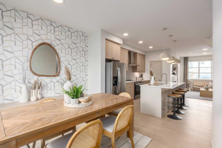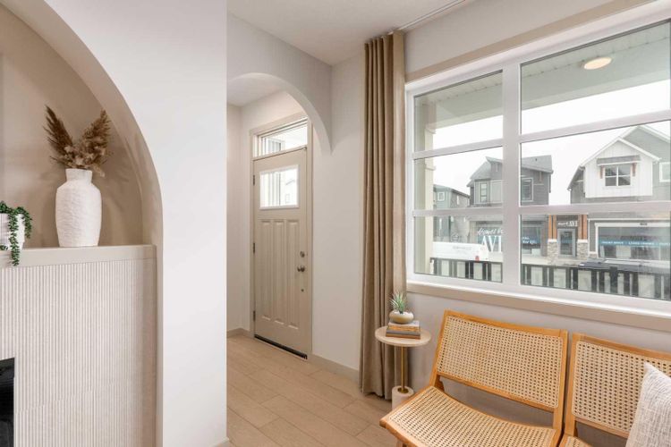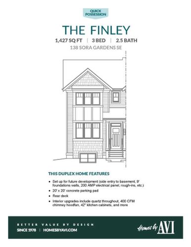 THERE’S A SPECIFIC KIND OF BUYER WHO THRIVES IN A BRAND-NEW COMMUNITY: the one who sees fresh pathways, brand-new parks, and a neighbourhood just beginning to take shape — and thinks, “Perfect. I get to grow with this place.” If that’s you, WELCOME TO SORA! The ponds are in, the green spaces are mapped, the playgrounds are ready for their first round of neighbourhood kids, and the long-term plan is already well underway.And the home itself? It’s refreshingly practical. The Finley skips the gimmicks and focuses on function: a main floor with real circulation (no odd dead corners), a living room that fits an actual sofa, a kitchen with taller 42" cabinets, QUARTZ COUNTERTOPS, a 400 CFM CHIMNEY HOODFAN, and storage solutions that feel designed by someone who has actually unloaded groceries before. The colours stay calm — neutral wood-look LVP with subtle undertones, rich dark cabinetry, and matte black accents — so your furniture doesn’t have to fight for attention.Upstairs, the primary bedroom gets a surprisingly cheerful perk: a WALK-IN CLOSET WITH A WINDOW, making it feel more like a tiny dressing room than a storage space. QUARTZ IN BOTH FULL BATHS keeps the finishes consistent, and the laundry is conveniently located on the upper floor, saving you from the dreaded “two-flights-of-stairs-with-a-basket” routine.The basement, though, is the real long-term win: SEPARATE SIDE ENTRY, 9' FOUNDATION WALLS, 200-AMP PANEL, with BATHROOM, LAUNDRY AND BAR SINK ROUGH-INS ready to go when you are. Future-you is going to be very smug about that. Out back, you’ve already got the 20'×20' parking pad and a rear deck for your first Sora summer.Here’s the thing about buying early in a new community: the perks accumulate quietly. You learn the WALKING PATHS before they hit the brochures, you MEET NEIGHBOURS before everyone retreats behind mature trees, and you get to watch EVERYDAY CONVENIENCES appear one by one — PARKS, SCHOOLS, SHOPS — until suddenly you’re the “original own er” people ask for advice.If a MOVE-IN READY HOME WITH LONG-TERM POTENTIAL is what you’ve been waiting for, go ahead and book a showing — this one deserves a walk-through. • PLEASE NOTE: Photos are of a finished SHOWHOME of the same model – fit and finish may differ on finished spec home. Interior selections and floorplans shown in photos. (id:26452)