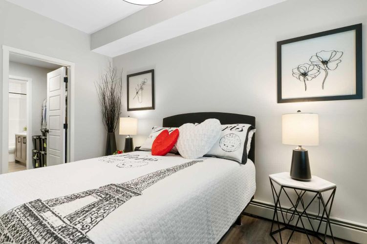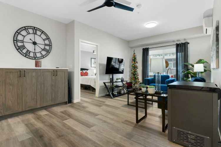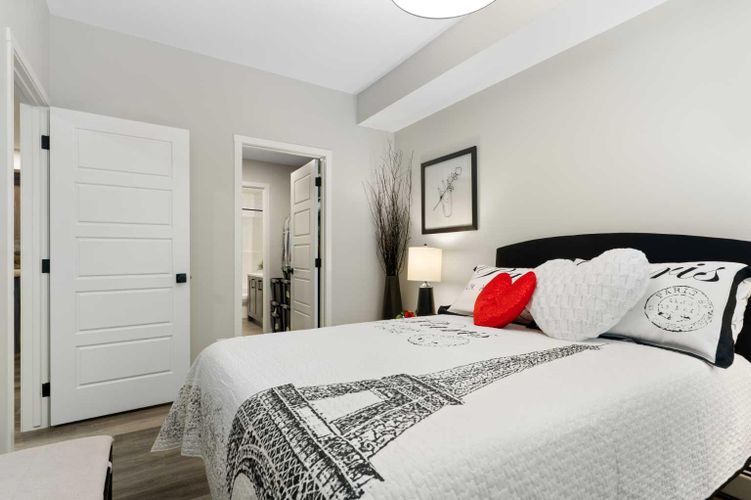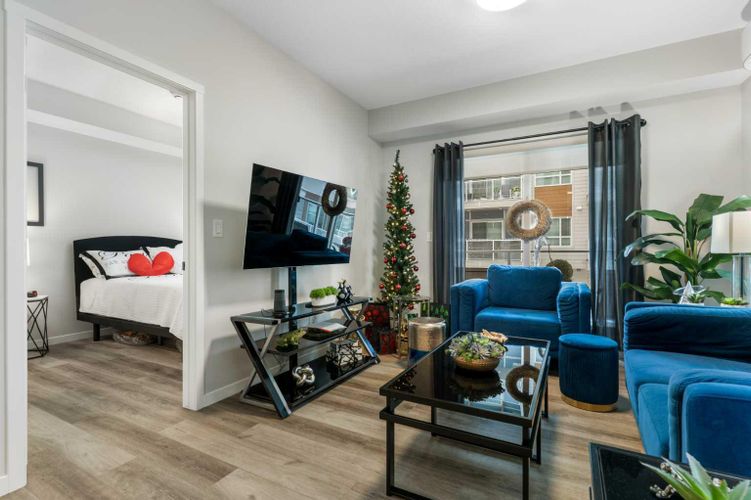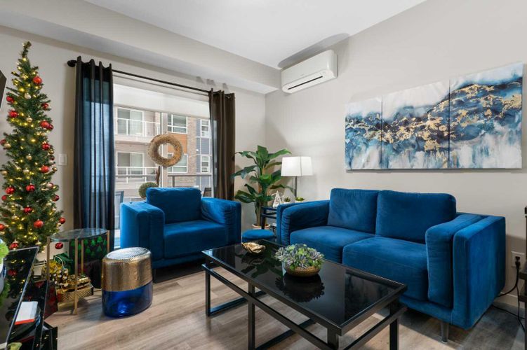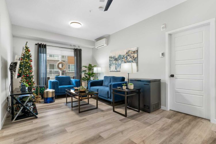 Step into comfort, style, and elevated living in this beautiful 2-bed, 2-bath condo in The Rise at The Parks of Harvest Hills. Built by Cedarglen Homes, and lovingly maintained by its original owners, this home stands out with premium upgrades and central AC for year-round comfort. From the moment you arrive, pride of ownership is evident. The welcoming entry leads into a bright, modern kitchen that makes both everyday cooking and hosting feel special. Featuring a large island with seating, quartz countertops, stainless steel appliances, and a stylish chevron tile backsplash that create a high-end look and feel. Plenty of cabinetry and a pantry give you the storage every homeowner wants without sacrificing clean, contemporary design. Luxury vinyl plank flooring runs throughout the main living spaces for durability and a modern finish. In the dining area, the builder-upgraded built-in adds character and practical storage, making entertaining effortless. The spacious living room has the perfect layout for relaxing, movie nights, or hosting game night with friends. Slide open the patio doors to your oversized private balcony. With room to lounge or dine, built-in exterior lighting, and a BBQ gas line ready to go, this becomes an outdoor extension of your home that you will love from morning coffee to summer evenings. The primary bedroom is tucked away on its own side of the home for privacy and peace. There is plenty of space for a king-sized bed and additional furniture, while the walk-in closet features custom built-ins designed to keep life organized. The 4-piece ensuite is bright, fresh, and calming. It feels like your own personal retreat at the end of a long day. Across the unit, the second bedroom offers flexibility for guests, a roommate, a nursery, or the perfect work-from-home office. The adjacent 3-piece bathroom includes a full-size walk-in shower with upgraded fixtures for a sleek and modern finish. Back near the entry, the laundry room truly sets this hom e apart. Builder-installed upper cabinets and extra shelving ensure everything has a place and stays clutter-free. A luxury rarely found in condo living. This space also doubles as your front closet with plenty of room for shoes and jackets. Your titled underground parking stall is conveniently just steps from the elevator, making grocery runs effortless. An assigned storage locker and secure bike storage are also included on the same lower level, giving you even more room for the things you love. You are perfectly positioned here. Minutes from the airport, close to Deerfoot and Stoney Trail, and a short stroll to restaurants, local shops, Landmark Cinemas, parks, tennis courts, and schools. Convenience and comfort come together seamlessly. Whether you are downsizing, investing, or purchasing your first home, this upgraded condo offers a level of quality and lifestyle that truly stands out.Welcome home to The Rise at The Parks of Harvest Hills. (id:26452)
