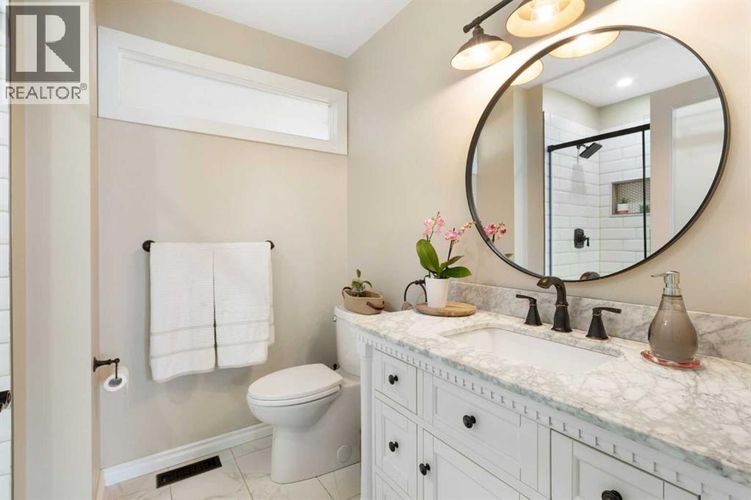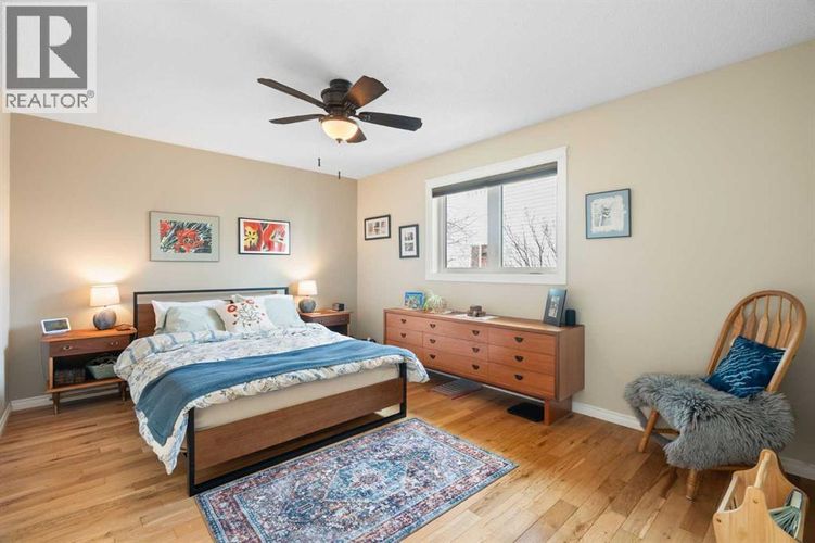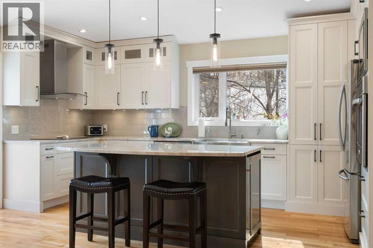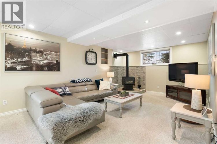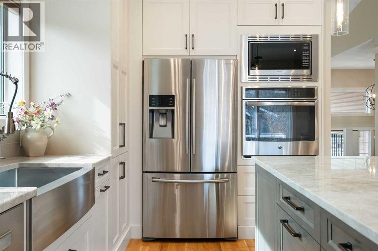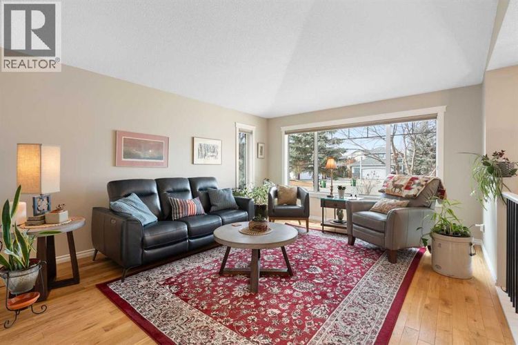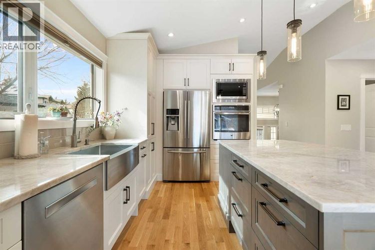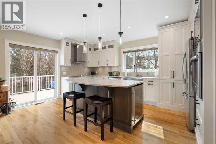Rare opportunity to own an original-owner, custom-built bi-level by Schickedanz in the prestigious community of Bow Meadows. Tucked away in a quiet cul-de-sac with no through traffic, this meticulously maintained home sits on one of the largest lots in the area (668 SqM).The main floor is a showcase of timeless design, featuring vaulted ceilings and stunning hardwood floors. The gourmet-style kitchen is a masterpiece, boasting quartzite counters, ceiling-height soft-close cabinetry, a farmhouse sink, and a high-end stainless appliance package featuring an induction cooktop and built-in wall oven. A central island with breakfast bar and a built-in beverage cooler make this the ultimate space for entertaining. Retreat to the primary bedroom, complete with a walk-in closet and a 3-piece ensuite with heated floors.The fully developed lower level offers a spacious rec room with a wet bar, a cozy natural gas fireplace, two additional bedrooms, and a 4-piece bath with heated tile floors. Mechanical integrity is a priority here: Poly-B has been replaced with Pex, the hi-efficiency furnace and central A/C are newer (2023), and attic insulation was upgraded to R55.Outside, the massive south-facing backyard is a private oasis with a large deck, private patio and mature trees. Enjoy direct access to walking paths leading to the Bow River, with schools and shopping just minutes away. Complete with an insulated, drywalled, and heated double garage—this home is truly turn-key. (id:26452)