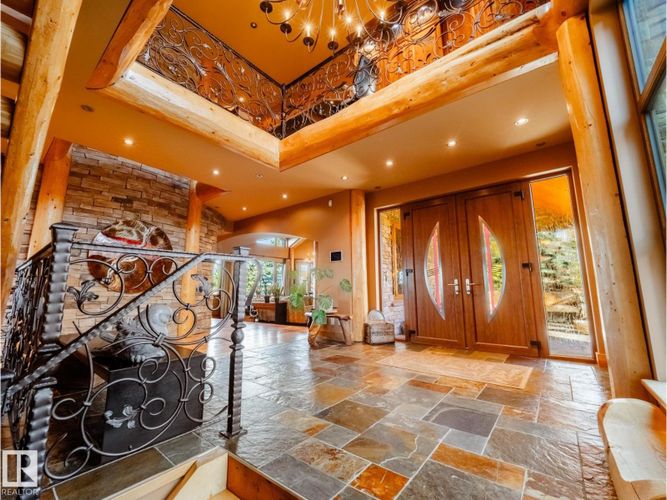 Private Moose Lake waterfront paradise w/ property extending to the water’s edge! Executive 5.64-acre estate blends luxury w/ natural beauty. Features professionally designed grounds, private boat launch, paved drive, grand front fountain & resort-style amenities. 6877 sq.ft. home impresses w/ old canary wood floors & timber framing. Great room offers a stone fireplace, wet bar & west facing sun room. Chef’s kitchen w/ Viking gas stove, espresso bar, wood- burning oven & butler’s pantry. Live edge staircase & custom iron railings leads up to a loft office. 4 Bdrms + 6 baths including a primary w/ spa ensuite, private balcony & walk through closet room to laundry. Walkout basement w/ theatre room, gym, sitting area & extra laundry. Indoor pool/hot tub room rivals any resort w/ heated floors & smart climate control. Triple heated garage, log shop w/ 14' overhead doors & potential for suite, extra 28' X 40' shop, RV hookups & smart home automation. A Rare, Fully Loaded Retreat Built For Elevated Living (id:26452)
