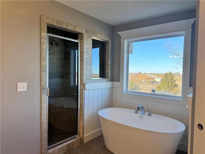 This stunning Niko new construction home, built by Prieb Homes, is located in the highly sought-after Woodland Hills community in Olathe. The location offers easy access to highways and shopping, making it a convenient place to call home. The Niko plan is a spacious 5 bedroom, 4 bath home, perfect for families or those who enjoy having plenty of space. As you enter the home, you'll be greeted by a spectacular two-story entry that creates a grand impression. The open floorplan offers ample space to entertain and make memories with loved ones. The great room features a beautiful stack stone fireplace that adds a cozy touch to the space. The kitchen is sure to impress with its CL cabinet package, complete with soft close drawers and doors, a hood, apron sink, and built-in microwave. The large center island is perfect for meal prep and hosting guests, while the painted cabinets and walk-in pantry add both beauty and practicality. The breakfast room overlooks a covered patio, creating a perfect space for outdoor relaxation and enjoyment. The main floor bedroom is perfect for guests, a playroom, or a home office, providing flexibility and versatility to the home. Upstairs, the master suite is a true retreat, featuring a spa-like bath with a freestanding tub and a large walk-in closet. The laundry room is conveniently located next to the master suite, making laundry day a breeze. The home features beautiful stone accents and today's colors, creating a modern and stylish feel. The photos are of a previously completed sold Niko plan, some features and selections may not be included in this particular home.