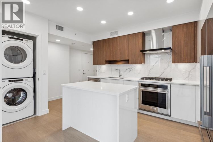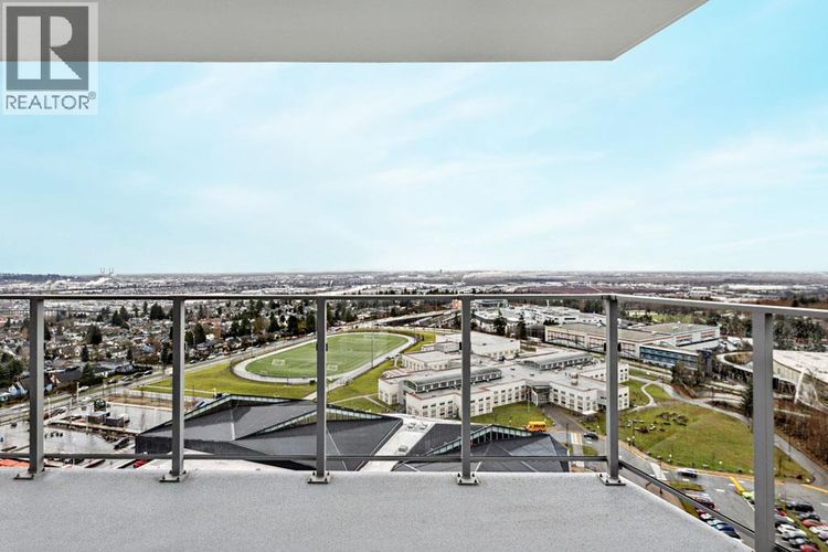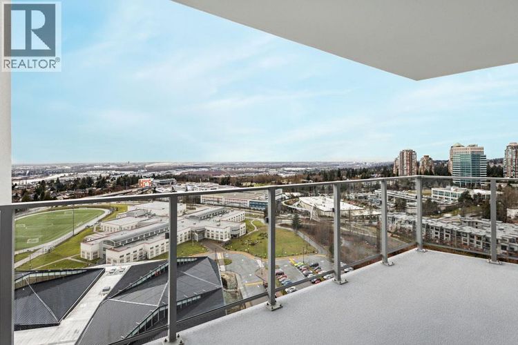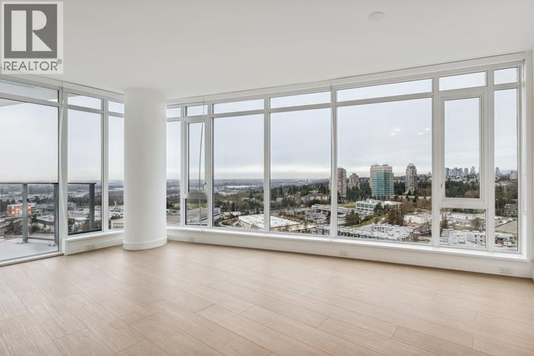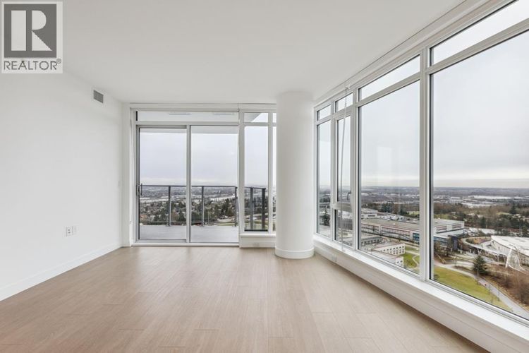 This 874sf southwest-facing corner unit features floor-to-ceiling glass walls on two sides, filling the space with natural light and offering 180-degree views of Burnaby South, Fraser Valley, and Fraser River. The home has light laminate floors and an insuite heat pump (system only) for year-round comfort. The gourmet kitchen offers two-toned cabinetry with pantries, a large island with breakfast bar, quartz countertops, porcelain backsplash, LED fixtures, and stainless-steel appliances including a gas cooktop. The living room opens to a 135sf covered balcony. The primary bedroom has balcony views, a walk-in closet, and a 3-piece ensuite with frameless glass shower. A second 4-piece bath has a soaker tub. Rent includes one parking stall and one bike locker. NOTE: First month rent free.