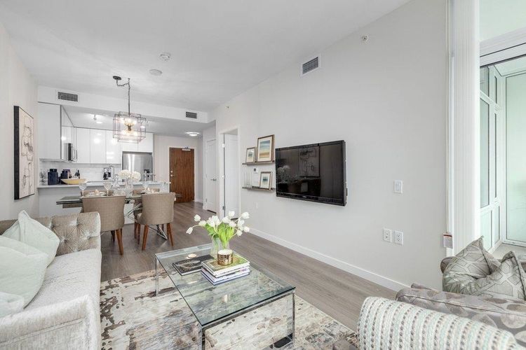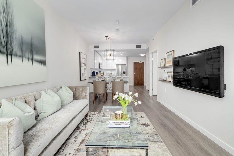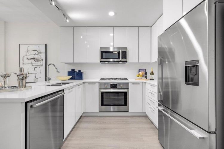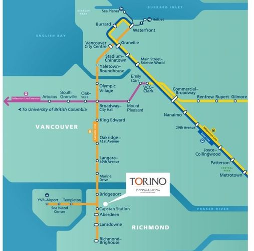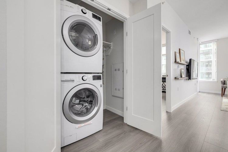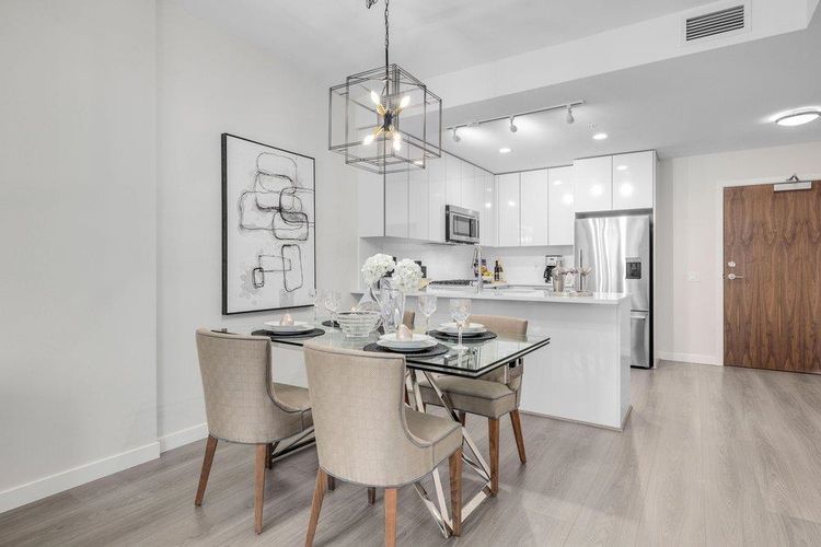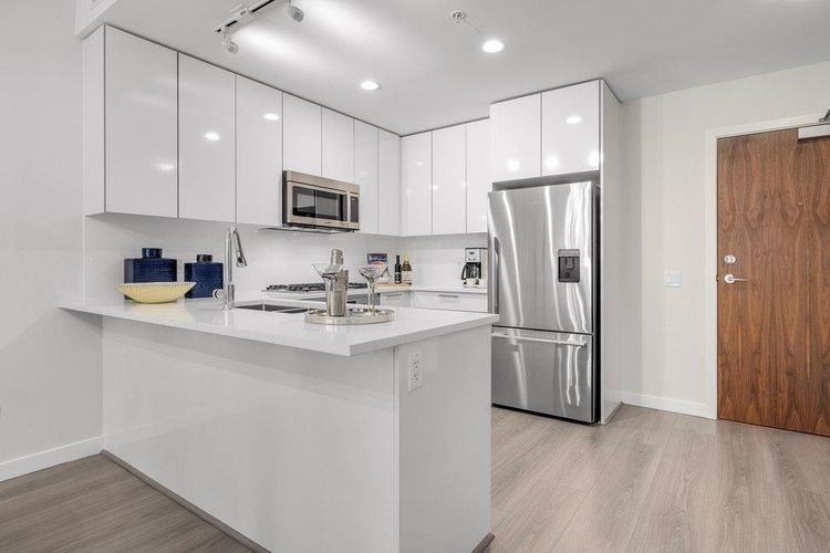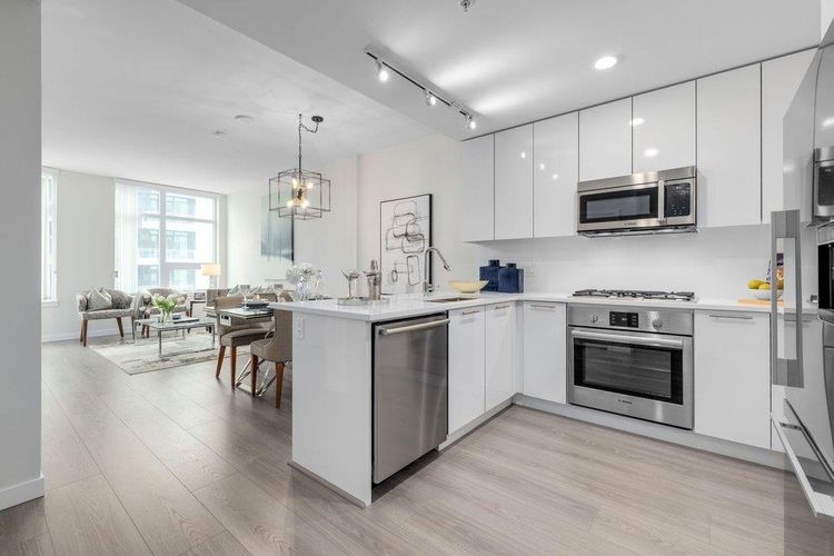 Beautiful new 1 bedroom diplay unit at Torino North. Airy and spacious throughout with extra large chef's kitchen & full-size appliances, high ceilings, wide-plank laminate flooring, and heat pump cooling/heating. Convenient location with services, groceries, restaurant & the Capstan Canada Line Station all a couple minutes walk away. Ready to move in. Weekend open Dec 27 & 28 from 12-4pm.