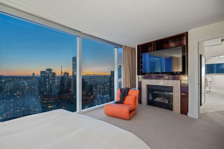 Experience panoramic views of Vancouver's skyline and ocean from this air-conditioned 32nd-floor skyhome spanning 794 sqft with 1.5 bathrooms. Floor-to-ceiling windows flood the space with natural light and frame the breathtaking scenery, while the layout ensures comfort and functionality. The expansive primary bedroom is a private sanctuary featuring mesmerizing city views, a cozy gas fireplace, and a luxurious ensuite with a soaking tub and separate shower. Residents enjoy exclusive access to premium amenities, including a fitness centre, indoor pool, housekeeping, room service, and 24-hour concierge. Step outside and find Vancouver's finest dining, shopping, and entertainment just moments from the lobby. This exceptional home is complete with two EV-ready parking stalls and one storage. OPEN Sunday, December 14th 2-4pm (id:26452)