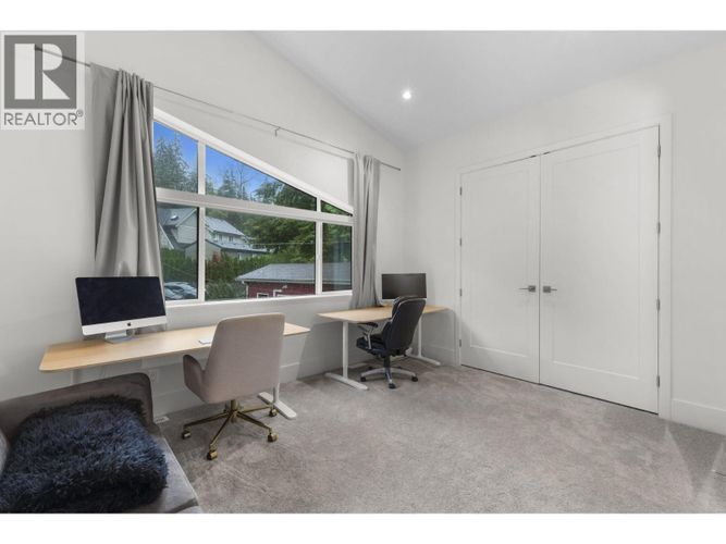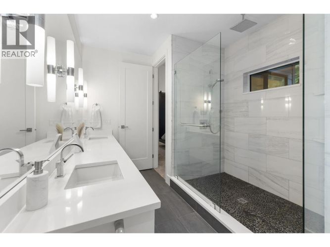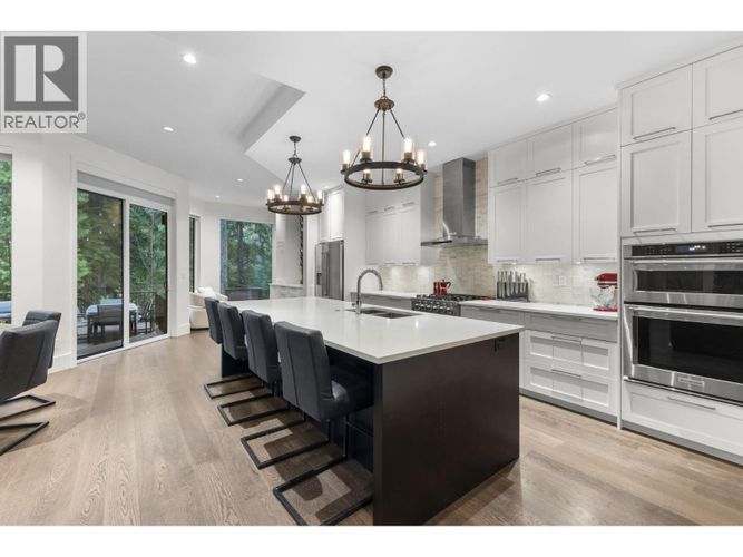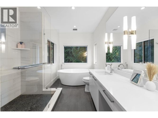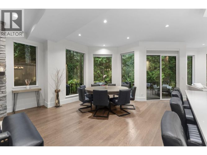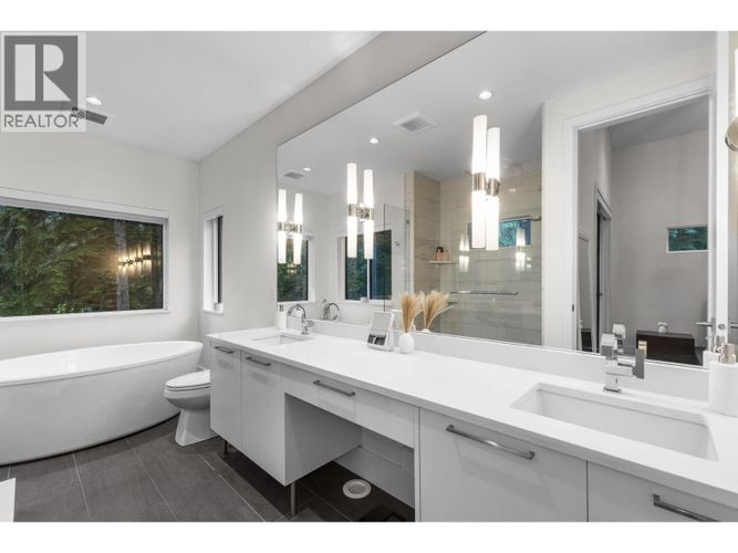 There´s living near the forest, and then there´s living in it. Just a 10 minute walk from Buntzen Lake, this custom modern home brings nature right to the glass line. Oversized windows frame tall evergreens, while warm wood and stone finishes wrap around two gas fireplaces. The chef´s kitchen features double ovens, one full fridge, one mini fridge, and one wine fridge. Spa bathrooms include glass showers and a deep soaker tub set beside forest views, perfect for quiet forest bath calm. A custom wine wall by a world renowned artist adds a striking focal point. Downstairs, a fully separate suite with its own kitchen, fridge, entry, and laundry offers true independence. Outside, decks, hot tub, and treed canopy create total retreat. (id:26452)