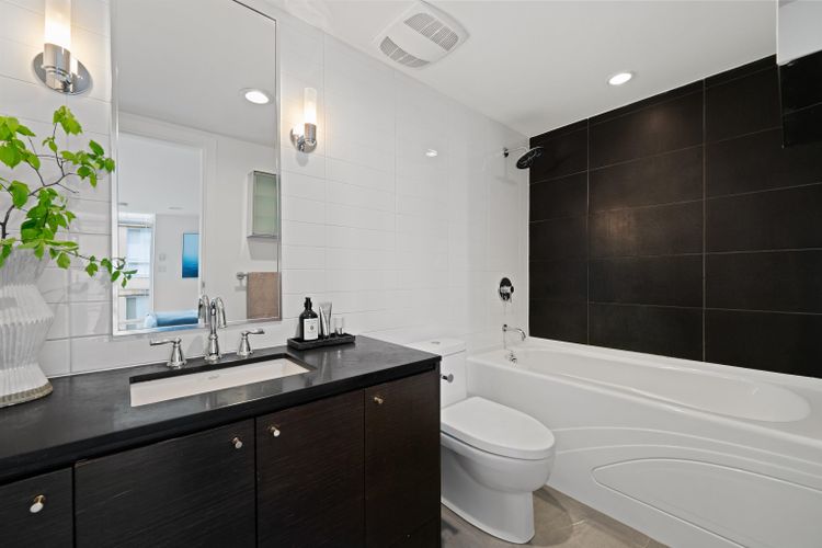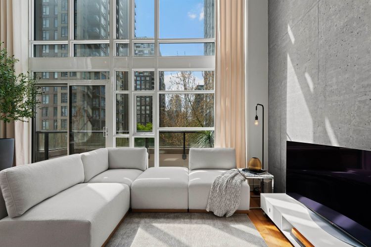 Welcome to ‘Tribeca Lofts’ rare corner 2-level Yaletown loft w/ tons of natural light. Truly one-of-a-kind! A functional 803 sq layout, this home features double-height 17’-3” ceilings, NEW blackout automated roller blinds, exposed concrete feature wall, floating steel staircase, & custom floor-to-ceiling draperies. Enjoy the bright main floor living room & kitchen (opening onto the full-width terrace), a spacious dining area, versatile den, powder room & a large entry closet w/ laundry. Upstairs you'll find the bedroom (w/ large window!) & ensuite bathroom featuring a large vanity, timeless tile & accent lighting. ‘Tribeca Lofts’ is a boutique New York-inspired loft building w/ a recently completed full exterior envelope refresh. Steps to Yaletown restaurants, shopping & transit.