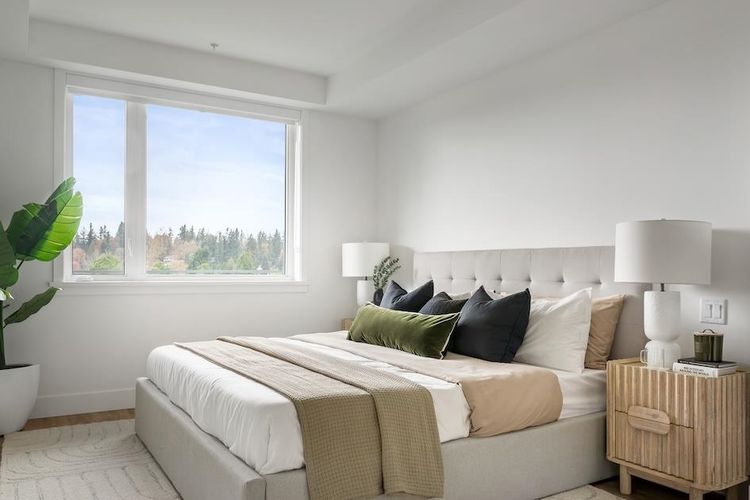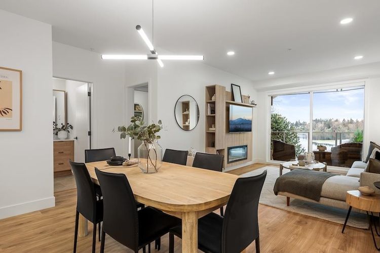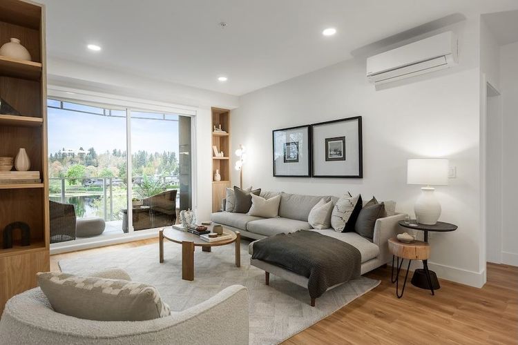 ELEVATED LAKE FRONT LIVING ON MILL LAKE! It is a rare opportunity to live on the shores of Mill lake, minutes away from Abbotsford's essential shopping amenities. Built by reputable local Fraser Valley developer and building Heinrichs Developments with over 30 years of experience in creating exceptional homes. This CORNER home offers 2 Bed and 2.5 Bath with 1,229 sqft of indoor living space & 154 sqft of outdoor space with lake views. This home features Air Conditioning, a stylish modern kitchen with quartz countertops, and Bosch appliances. Equipped with a dedicated in-home storage and side by side laundry. Elegant finishes throughout and a collection of optional features will heighten your living experience even more. Move in ready! Book your preview today!