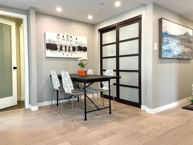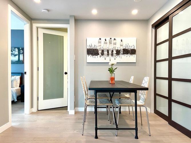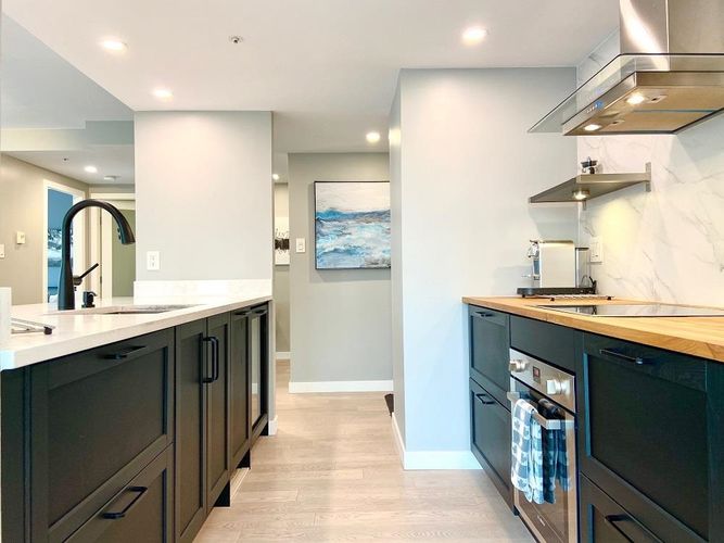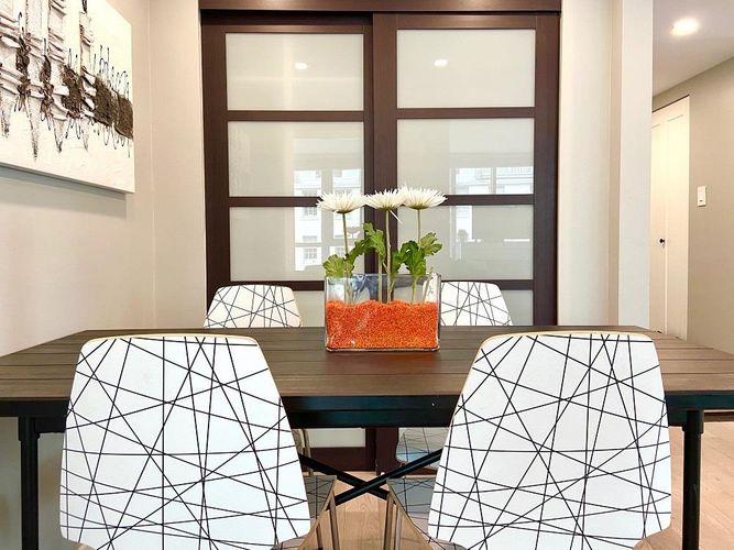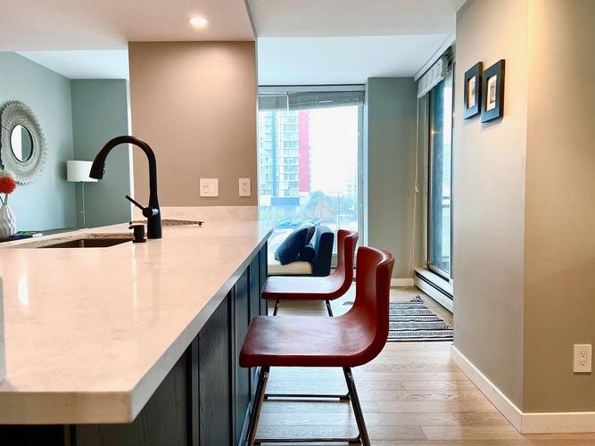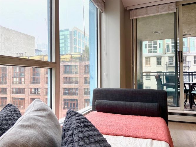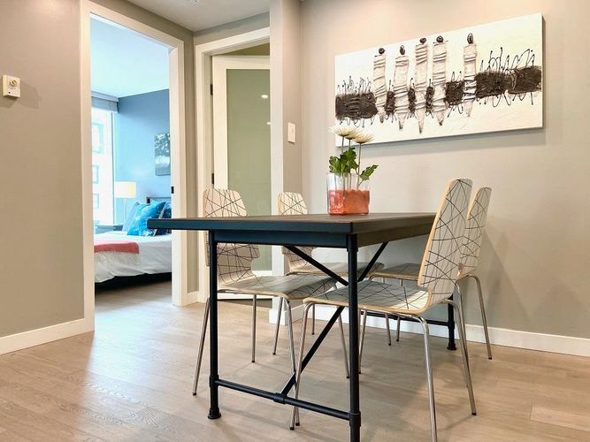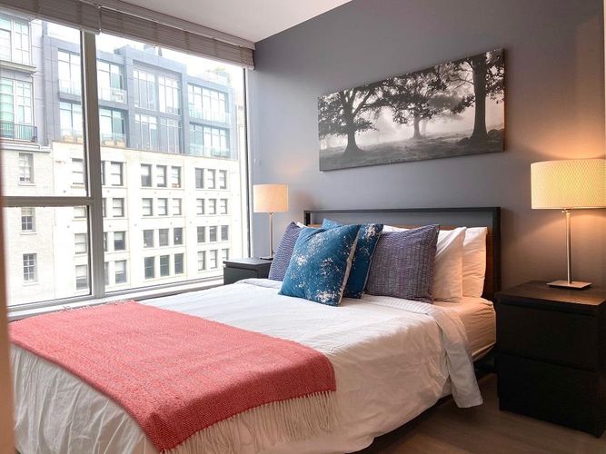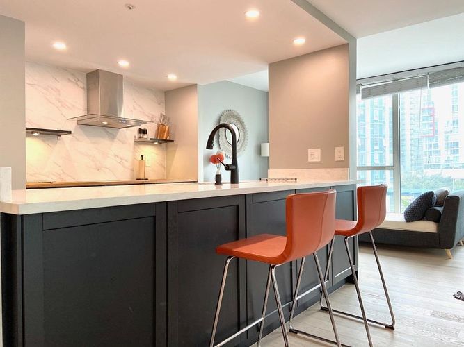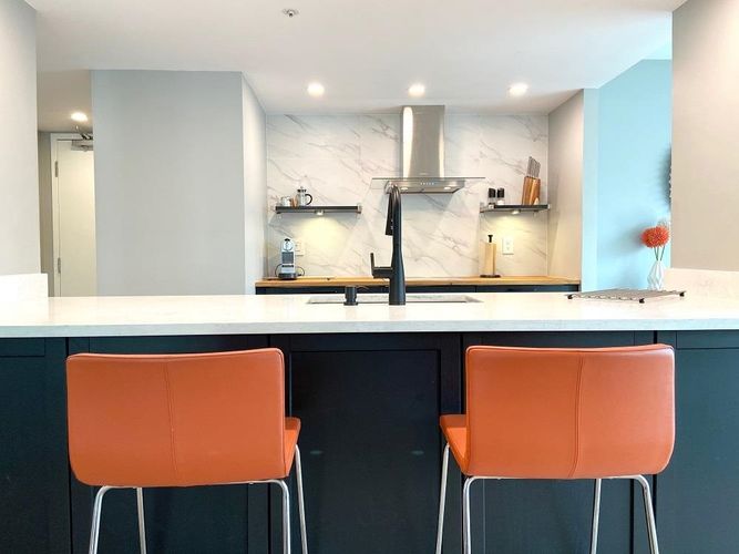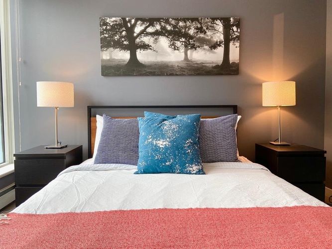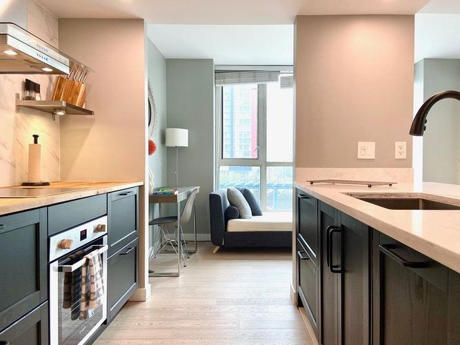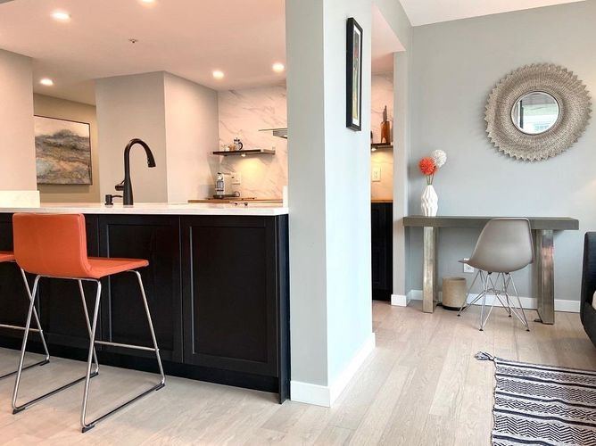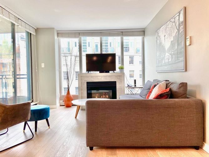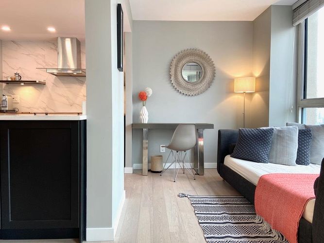 This spectacular 1 bedroom, 1 bathroom Vancouver Furnished Condo for Rent features beautiful modern décor, a large private balcony with city views, hardwood flooring, large windows, a den area and perfect amount of living space. Find a fireplace anchoring the main living space, an L-shaped sofa, modern home accents and access to the balcony. This open concept design enjoys a dining area complete with seating for 4 and access to a brilliant kitchen. The kitchen features beautiful dark cabinetry, a marble backsplash, quartz and wood countertops, a breakfast bar with seating for 2 and upscale Subzero and Bosch appliances. Find the den area with a perfect workstation and chaise lounger and enjoy the flexibility in this space.