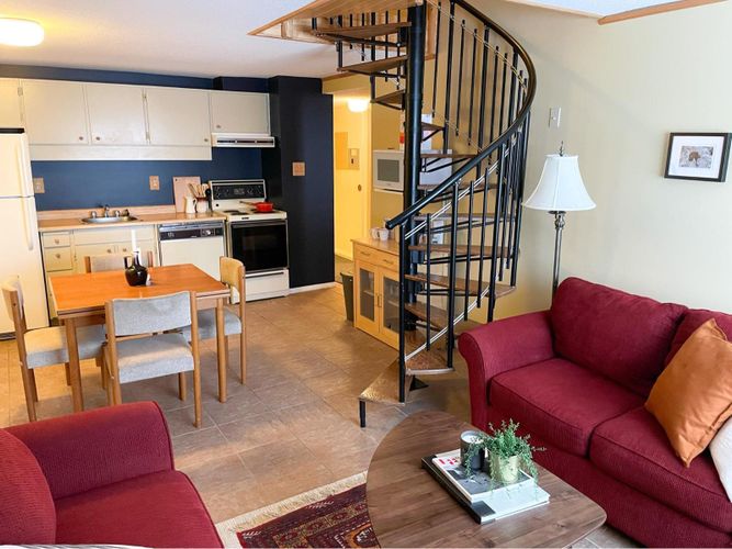 Excellent rental unit steps from the hill! This is the unicorn you've been searching for w/2 bdrms, 2 full baths & 2 lofts! In a condo you say? Let me tell you how! On the main you have an open kitchen and living area, 1 bdrm, 1 full bath, large storage room and south facing deck with valley views! As you head up the spiral staircase you enter the huge loft/family room that sleeps 4-6 more people. Through the loft or separate hallway entrance you enter the bachelor suite with 1 full bath, high ceilings, sleeping loft and kitchenette; lock-off & rent while staying in the main suite or vice versa! Also includes 1 indoor & outdoor parking stall, storage locker, amenities such as an outdoor pool (summer), spa (year round), adults & kids lounge & shared laundry. Must see!!! (id:26452)
