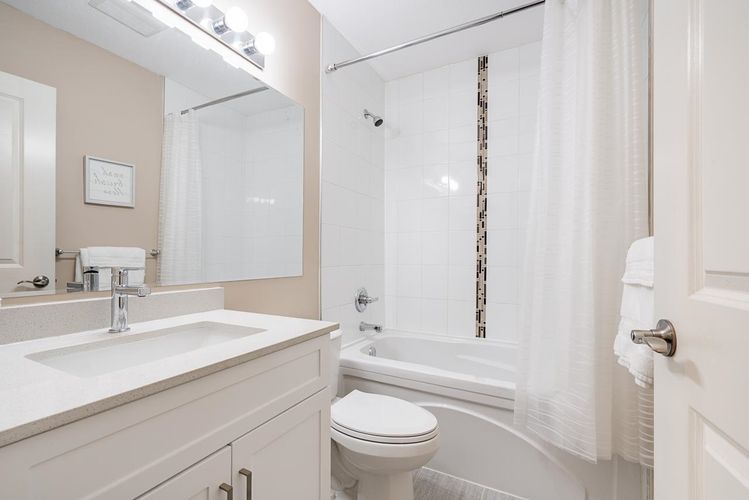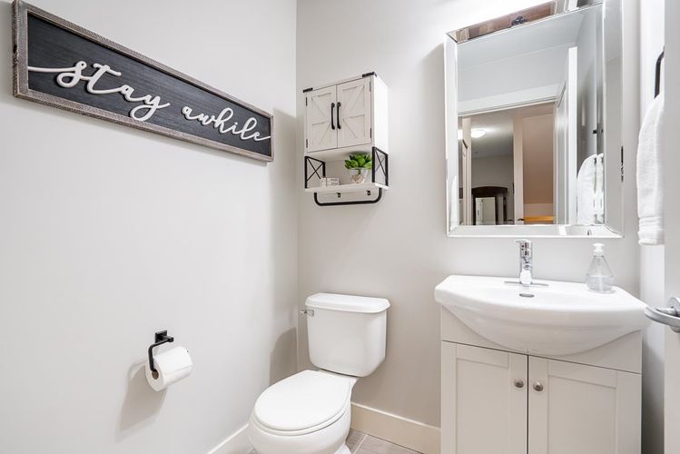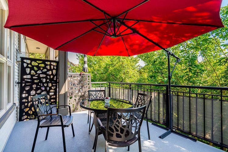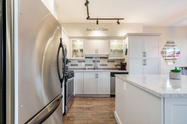 Welcome to Sunpointe! This bright & beautifully maintained townhome offers the feel of a detached home w/open-concept living & no stairs at entry - walk right into the main floor. The living & dining area seamlessly flows out to a private covered balcony, perfect for relaxing or entertaining. The spacious kitch is built for gathering, features granite countertops, gas range, S/S appli, & a large island. Upstairs, a massive prim suite features its own balcony, walk-in closet, & luxurious 5-piece spa en-suite w/double sinks, a soaker tub, & a shower, plus 2 generously sized bdrms. Downstairs includes a rec rm, bdrm, full bath, access to a lower patio, & great storage throughout - ideal for guests/teens. Close to parks, schools, & shopping. Absolute best-priced townhome in Willoughby Heights