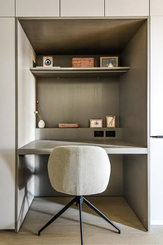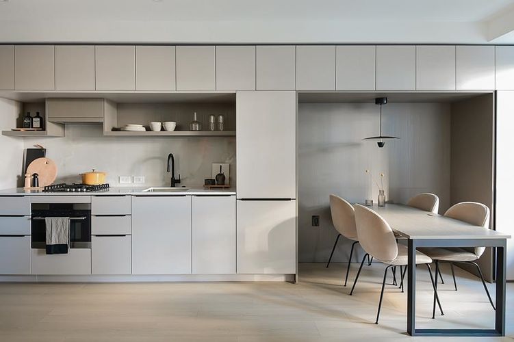 DEVELOPER FINAL HOME at hue by Marcon. Overlooking the courtyard, this 1 bedroom and 1 bathroom home features 35 ft of storage and custom millwork including a rare side-by-side washer and dryer typically found in larger homes. A built-in dedicated workspace, dining area, and additional storage with pantry space provide thoughtful everyday convenience. The kitchen includes custom European flat-panel cabinetry and an integrated appliance package, including a 24" Liebherr refrigerator, 24" AEG 4-burner gas cooktop with concealed hood fan, and a 18" Fulgor dishwasher. The spacious bedroom comfortably accommodates a king-size bed.