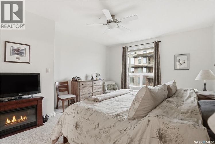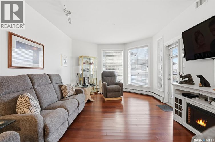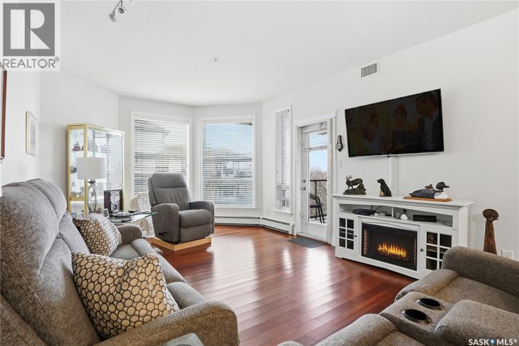 Welcome to The Landing and this well cared for, professionally managed condo, located on the river bank with a great river view, location for both quiet living and easy access to down town, shopping and freeways out of the city. The moment you walk in you are greeted by the clean and bright kitchen with white quartz countertops, light maple wood cabinets, stainless steel appliances including fridge, stove, dishwasher and microwave hood fan with direct vent to outside. It also has undercabinet accent lighting, pendant lights over the island with breakfast bar, a couple cabinet display doors and built in wine rack. Behind the kitchen is the dining area with rich hardwood floors that run into the living room and fill the condo with warmth. The off white walls in this living area add brightness and a lovely contrast to the flooring, there is plenty of space for your furniture and huge windows that fill the space with natural and healthy sunlight while giving you a fabulous view of the South Saskatchewan river side below. You can also access the back deck from here where you can relax and enjoy the suns warmth with your favorite bevy and prepare a meal on your barbeque that is connected to the natural gas outlet, and listen to the geese as they float by on the river. Down the hall you will find the spare bedroom with plush carpet across from the 4 piece bathroom. The master bedroom found at the end of the hall is huge, has cozy carpet flooring, a walkin closet and a 3 piece ensuite for your convenience. Across from the kitchen is a double wide coat closet and the laundry/storage room with stacked washer/dryer included. New to this unit is the stove, microwave, garburator, quartz countertops, sink and kitchen faucet. Enjoy the convenience of the heated underground parking and your own storage room, there is new clearcoat surface underground and new pavement outside. Close to the Meewasin Valley trail, Fred Mitchell and Gabriel dumont parks. Call today! (id:26452)