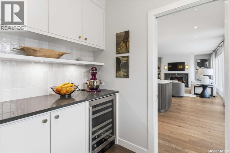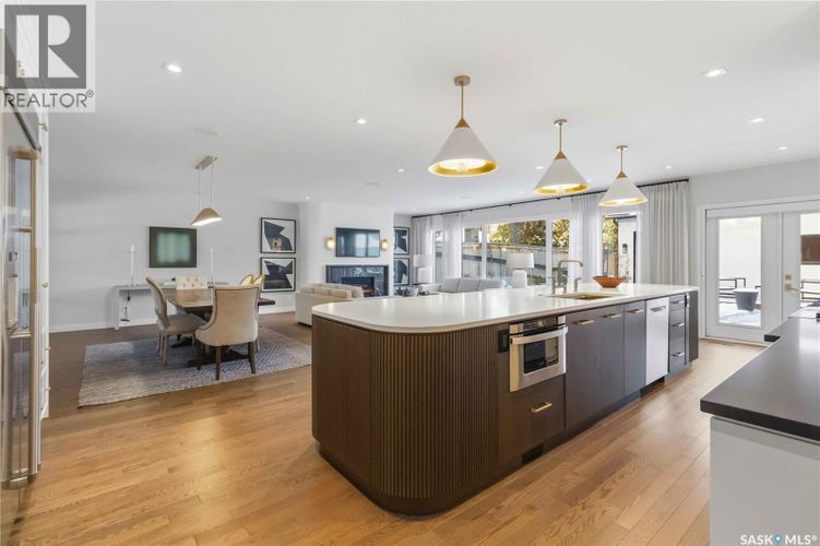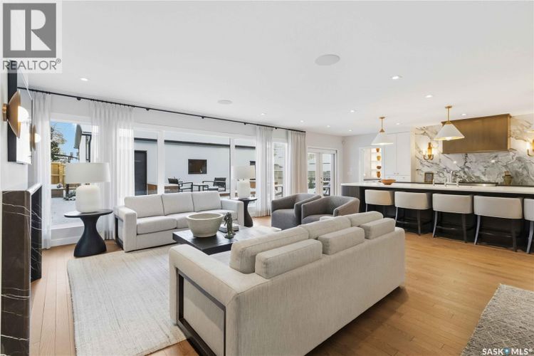 Welcome to 1134 Spadina Crescent E, an impeccably reimagined luxury residence where refined design meets exceptional craftsmanship. This two storey home offers 4 bedrooms and 4 bathrooms and was transformed through a professional, year long renovation by Atmosphere Interior Design from 2021 to 2022, showcasing uncompromising attention to detail throughout. The main floor features engineered oak flooring, custom ceiling and wall moulding, and a front executive office framed by steel doors and scenic river views. The showpiece kitchen is anchored by custom cabinetry with Restoration Hardware handles, a full slab marble backsplash, custom brass hood, sculptural brass lighting, and premium JennAir appliances. A statement oak island with fluted detailing, two garburators, artisan tile pantry backsplash, and refined finishes complete the space. The living area is warmed by a marble clad Town and Country gas fireplace and enhanced with motorized blinds, smart lighting, and built in speakers. Designer lighting by Kelly Wearstler, Restoration Hardware, and Arteriors creates a timeless, layered aesthetic throughout. New interior doors with Emtek hardware elevate both function and form. The primary suite is a spa inspired retreat featuring two walk in closets, heated tile floors, steam shower, Restoration Hardware mirrors, and Kelly Wearstler lighting. Secondary bedrooms are thoughtfully curated with designer wallpapers along with custom drapery. Additional highlights include a spacious mudroom, updated staircase with new spindles, and a timeless exterior finished in metal siding and stucco. Outdoor living is enhanced by a new composite deck completed last summer. The heated triple garage offers a drive through bay, slat wall storage, sub panel, and 240 volt plug. Other upgrades include new weeping tile with a sump pit. A rare and refined offering, blending elevated design, modern technology, and timeless elegance for an exceptional lifestyle opportunity. (id:26452)